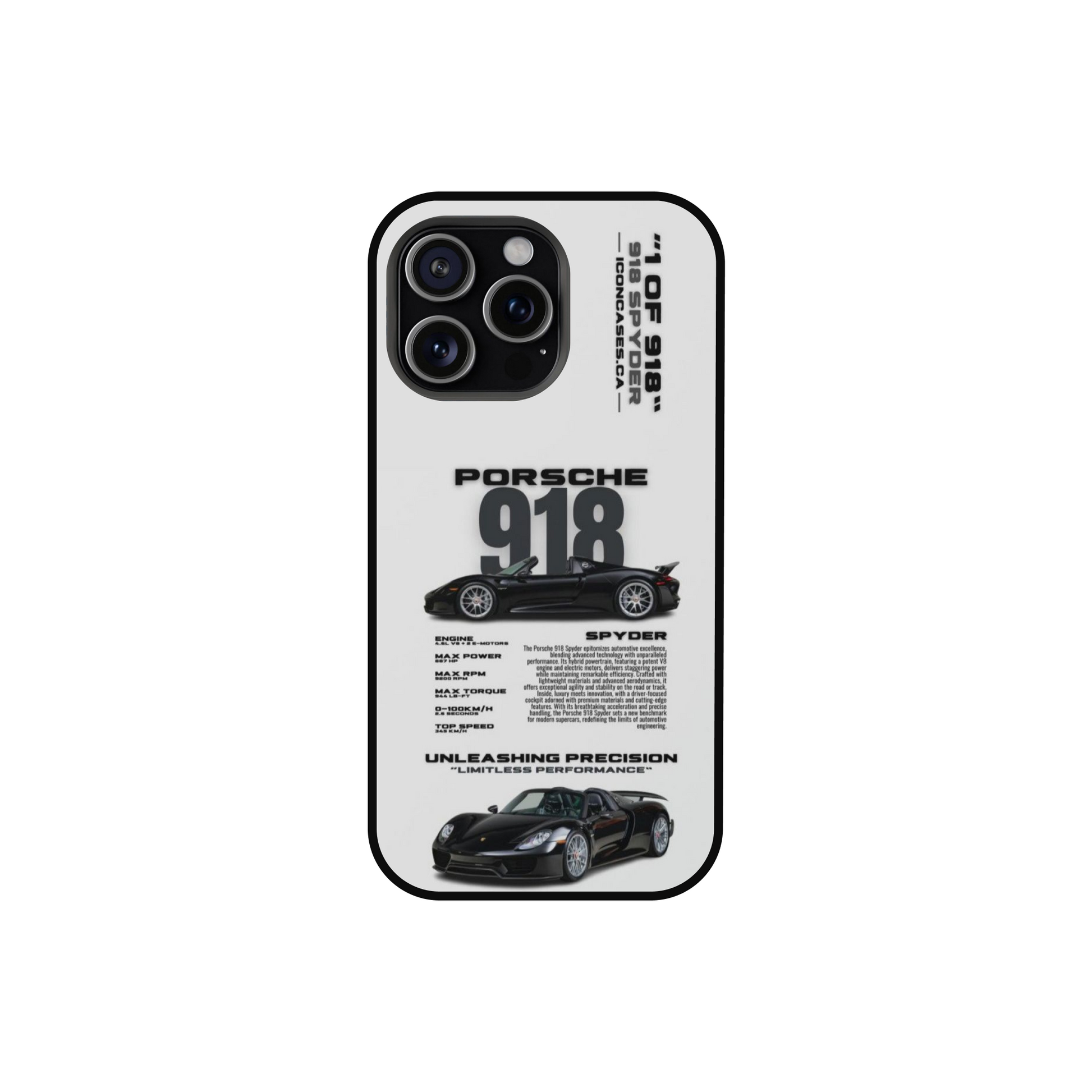 The ultimate hypercar flex. This Porsche 918 Spyder case features key performance specs and the exclusive "1 OF 918" code. Its a clean, minimalist design for the technically-minded gearhead who appreciates precision engineering.