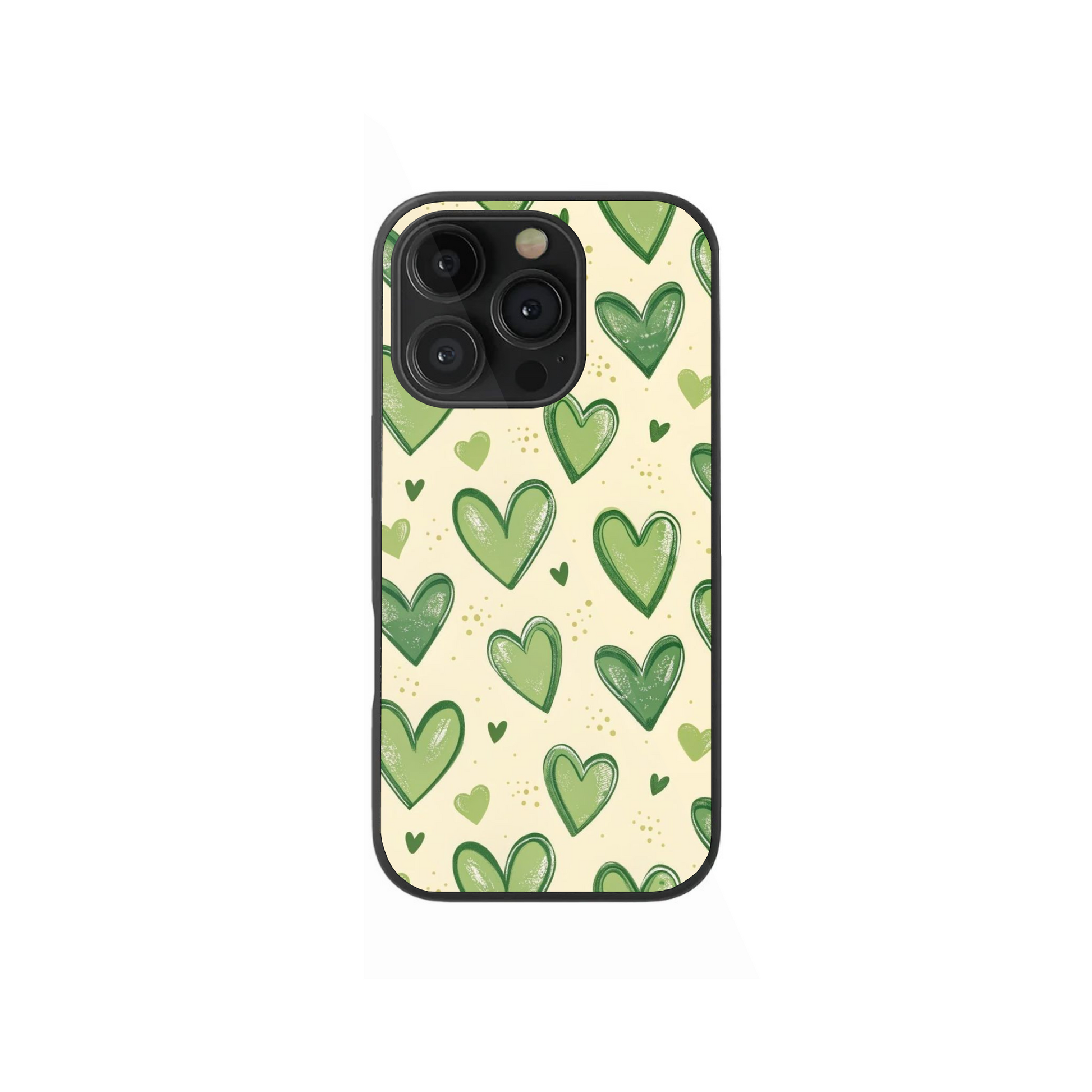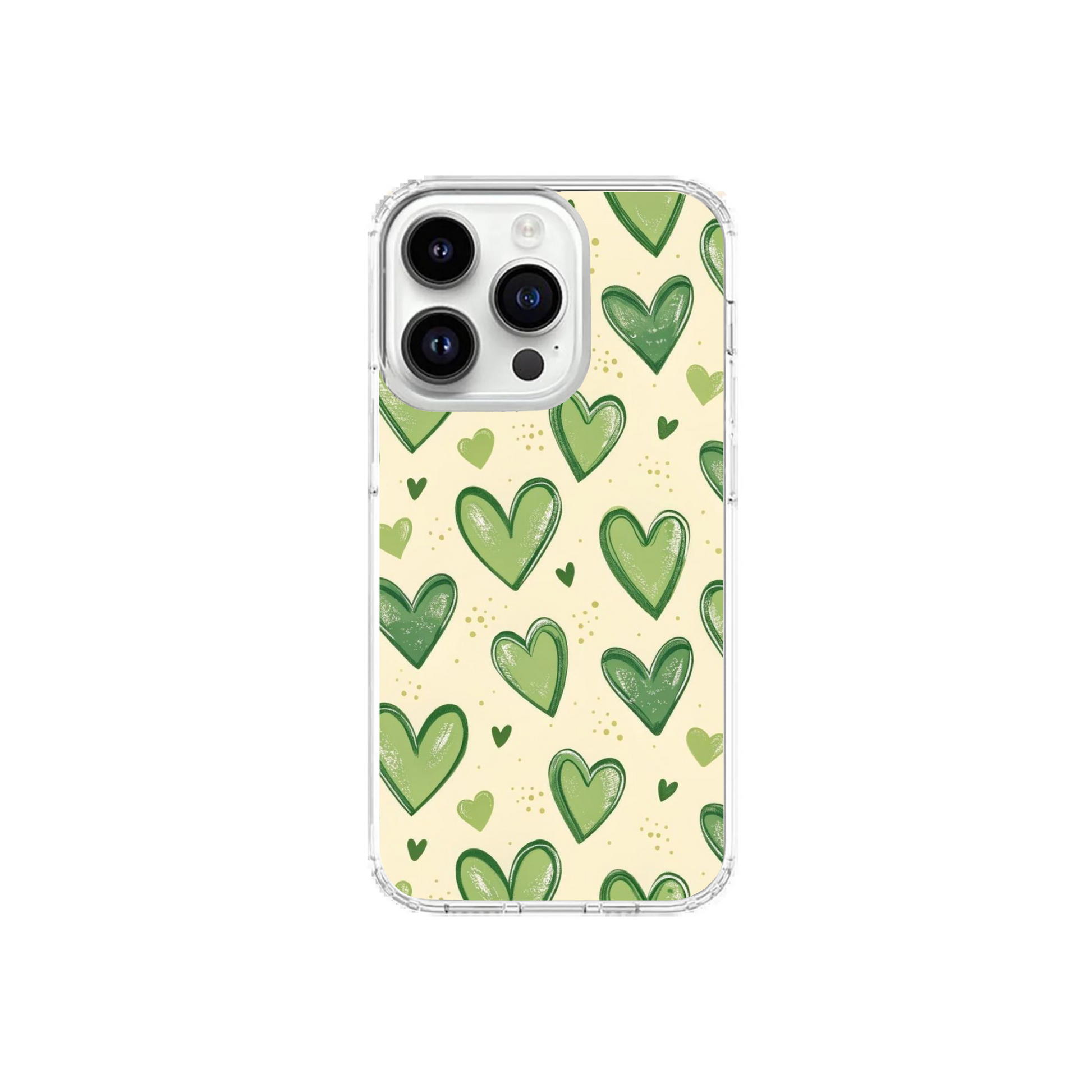 Keywords: Cute Green Hearts Case, Matcha Aesthetic Cover, Sketched Heart Pattern, Earthy Phone Accessories.